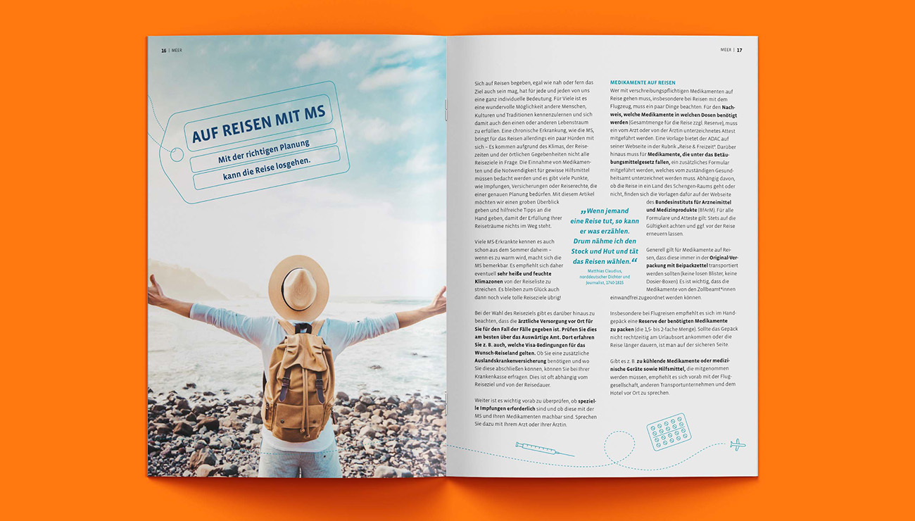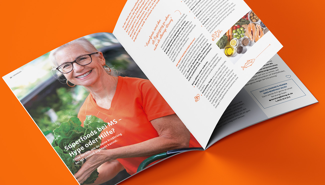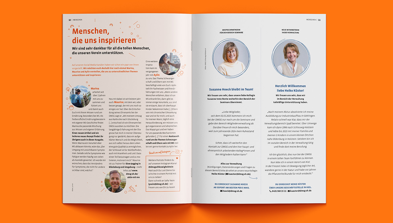 Das Redesign des Magazins richtet sich an Menschen mit Multipler Sklerose und verbindet klare Typografie, großzügige Weißräume und eine reduzierte Farbwelt. Kleine Icons und eine verspielte Handschrift schaffen Orientierung und verleihen dem Magazin einen modernen, nahbaren Charakter.
